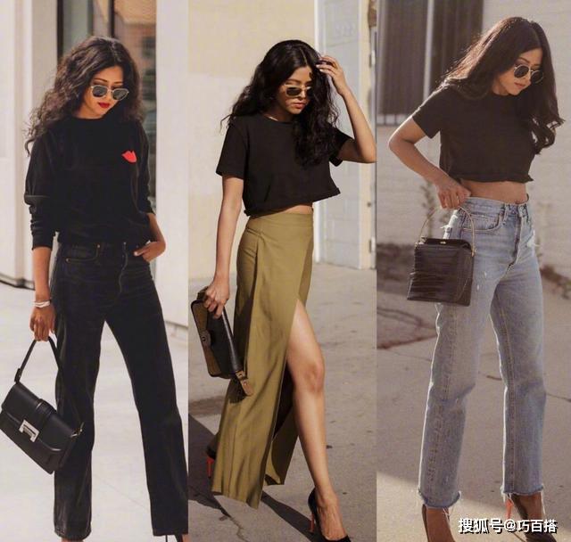 穿衣搭配單獨看一個造型是沒有感覺的,所以我們將三個造型在一個圖片上,對比來看效果。是不是短款的上衣加高腰的褲子會更加的顯高呢,的確如此。