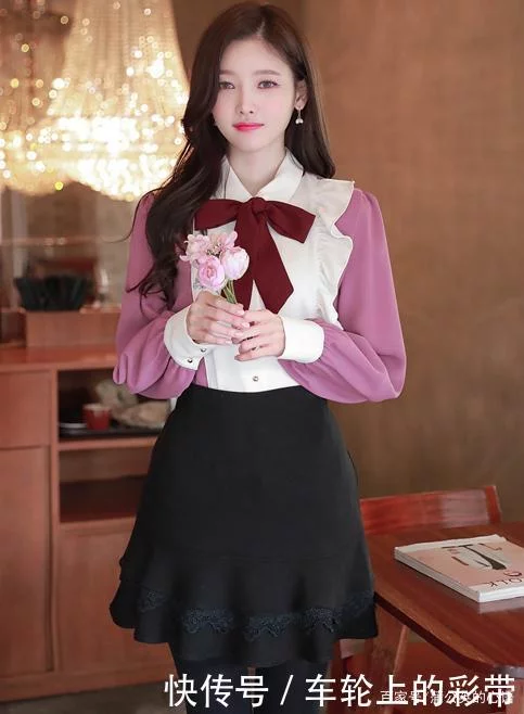 而且為了色調搭配上能夠呈現出一種簡約感,小姐姐選擇了一條黑色的薄款連褲襪去修飾腿部線條,這樣一來,腿部線條則是能夠被修飾出更加纖細,更加勻稱的效果。至於說上衣,小姐姐選擇了一件拼色款式的襯衣,紫色和白色的拼接,雅緻不失浪漫,尤其是在領口附近還加入了酒紅色的系帶,更是豐富了整個穿搭的細節。